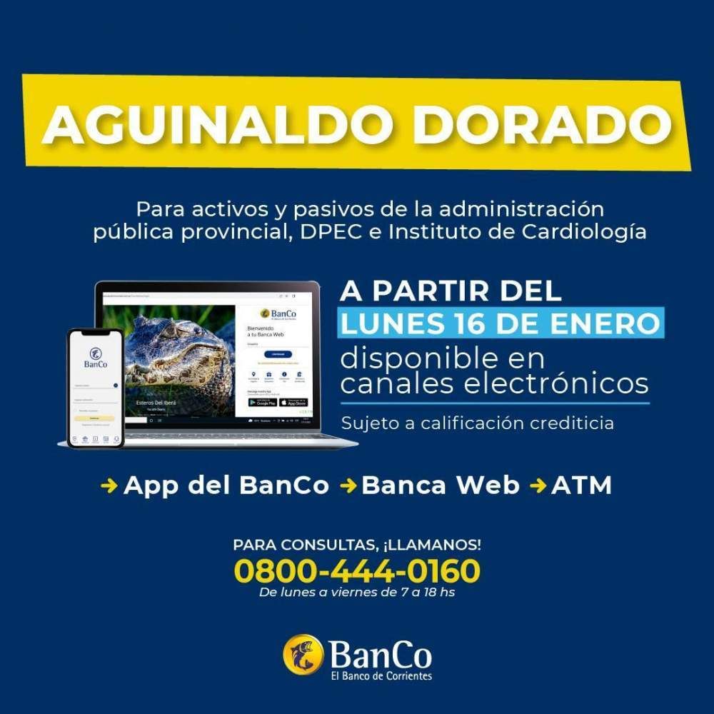 El Banco de Corrientes habilitó este lunes 16 de enero el anticipo de aguinaldo correspondiente al Sueldo Anual Complementario (SAC) de junio de 2023, conocido como “Aguinaldo Dorado”.