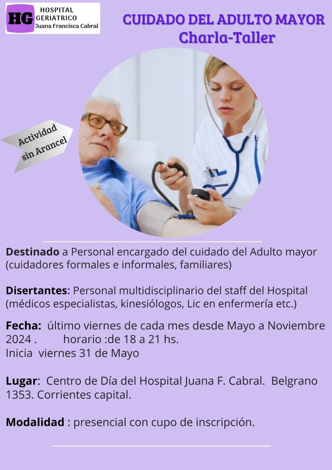 Organizado por el Hospital Geriátrico “Juana Francisca Cabral” de nuestra Ciudad, la charla-taller esta destinado a cuidadores formales e informales de la persona mayor .