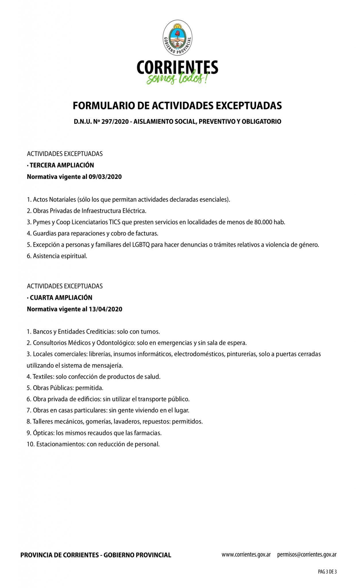 Desde la página del Gobierno provincial (https://www.corrientes.gob.ar/) se puede descargar la Declaración Jurada que cada trabajador debe completar con sus datos y el inciso correspondiente a la actividad que realiza, tal como dispone el Decreto de Necesidad y Urgencia (DNU) N° 297/2020 y las excepciones del Decreto provincial N° 650 del 11 de abril de 2020.