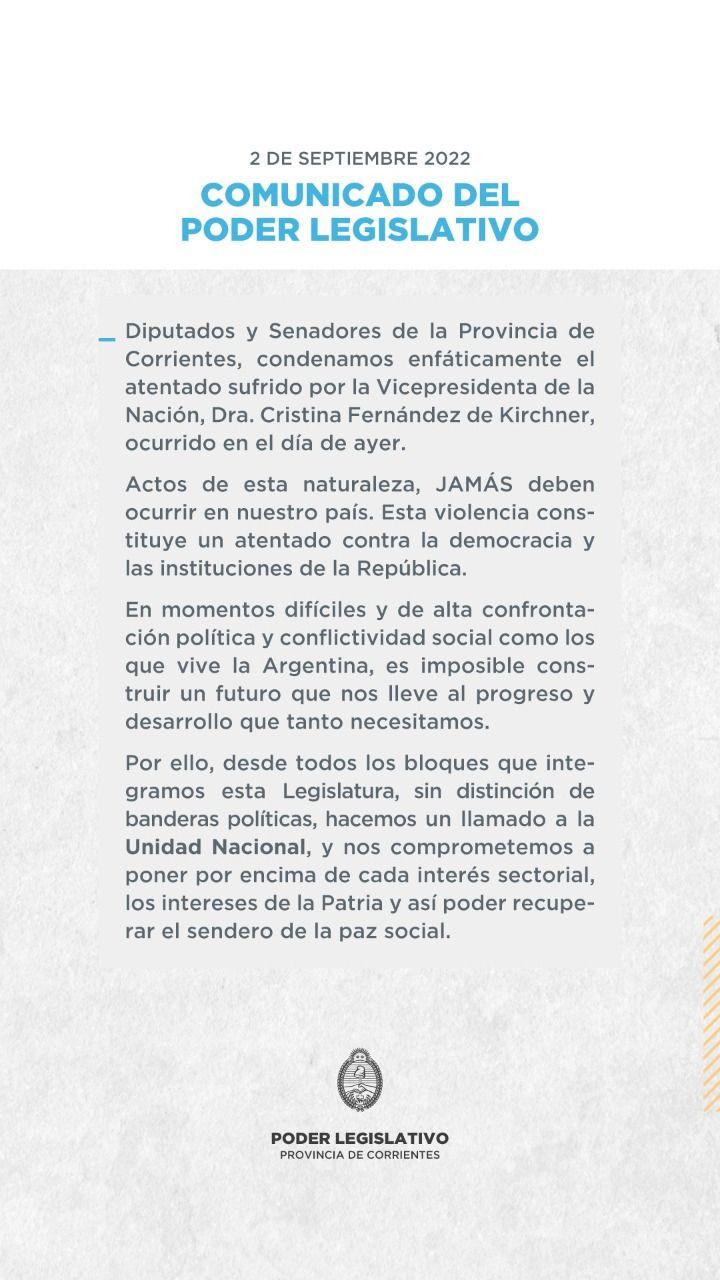 "'Las Cámaras de Diputados y Senadores de la Provincia de Corrientes, emitieron un comunicado en conjunto. El mensaje es el siguiente: Diputados y Senadores de la Provincia de Corrientes, condenamos enfáticamente el atentado sufrido por la VicePresidenta de la Nación, Dra. Cristina Fernández de Kirchner, ocurrido en el día de...