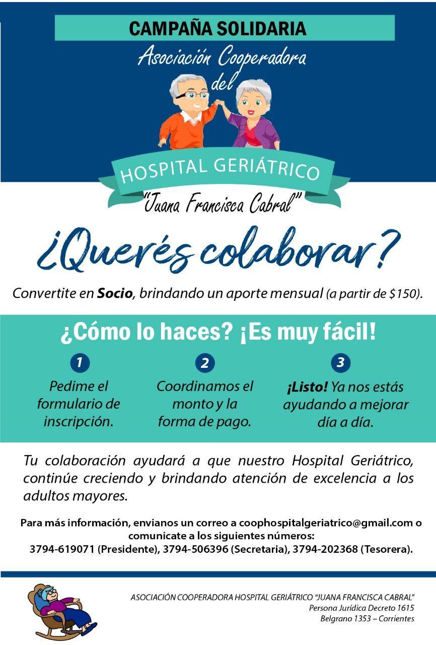 Desde el Hospital Geriátrico ‘’Juana Francisca Cabral’’ de nuestra Ciudad, lanzan la ‘’Campaña Solidaria’’ cuyo fin es alcanzar nuevos socios e invitar a los interesados a integrar la Cooperadora. De esta manera se busca también sumar voluntades para continuar acompañando la labor de la institución en la comunidad.