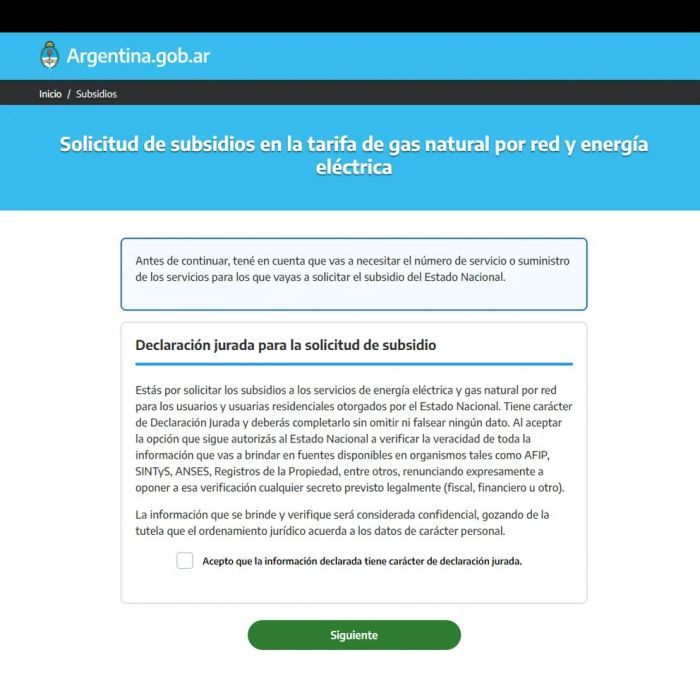 “Estás por solicitar los subsidios a los servicios de energía eléctrica y gas natural por red para los usuarios y usuarias residenciales otorgados por el Estado Nacional. Tiene carácter de Declaración Jurada y deberás completarlo sin omitir ni falsear ningún dato. Al aceptar la opción que sigue autorizás al Estado Nacional a verificar la veracidad de toda la información que vas a brindar en fuentes disponibles en organismos tales como AFIP, SINTyS, ANSES, Registros de la Propiedad, entre otros, renunciando expresamente a oponer a esa verificación cualquier secreto previsto legalmente (fiscal, financiero u otro)”, dice la advertencia.