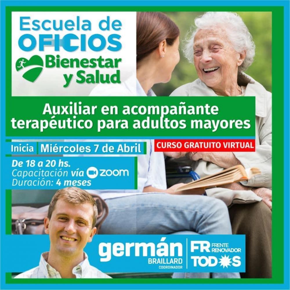 Se convoca a interesados a ser parte de la segunda edición del curso gratuito virtual de “Acompañante terapéutico para adultos mayores”. El mismo es impulsado y organizado por la Escuela De Oficios de Germán Braillard Poccard.