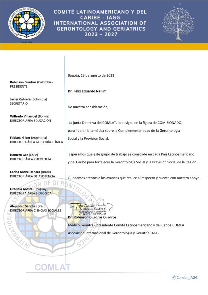 La Junta Directiva del Comité Latinoamericano y del Caribe (COMLAT) designó al Dr Félix Eduardo Nallim, ‘’Comisionado’’ para liderar la “Gerontoprevisión’’, Complementariedad de la Gerontología Social y la Previsión Social)