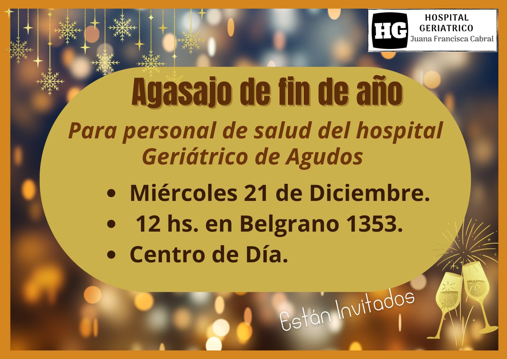La Dirección del Hospital Geriátrico "Juana Francisca Cabral" llevará a cabo el "Agasajo de fin de año, exclusivo para el personal de salud" de la institución. El encuentro será este miércoles 21 de diciembre en el Centro de Día , Belgrano 1353, a partir de las 12hs. Noticias Relacionadas Atención...