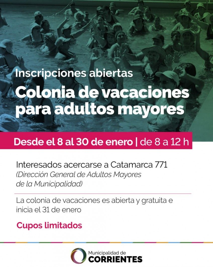 La Municipalidad de Corrientes organiza para este verano colonias de vacaciones gratuitas destinadas a niños y niñas de 5 a 12 años, y para adultos mayores, a partir de los 60 años, con inscripciones abiertas a partir del lunes 8 y cupos limitados. Desde el 31 de enero al 1 de marzo se llevará a cabo, de 8 a 12, en el Club Teléfonos Corrientes (CTC), la colonia de vacaciones destinadas a adultos mayores,donde las personas mayores desarrollarán diversas actividades de esparcimiento, deportivas y lúdicas, que serán coordinadas por un grupo de profesores. Los interesados deberán pasar por la Dirección General de Adultos Mayores, ubicada por calle Catamarca 771, en el horario de 8 a 12, hasta el martes 30 del corriente, para retirar una ficha que deberá ser completada por un médico para realizar actividad acuática y concretar así su inscripción. Ladirectora general de Adultos Mayores, Celina Thones, explicó que “la colonia se va a llevar adelante por la mañana, dividida en dos grupos: uno tendrá lugar los días martes y jueves, mientras que el otro será los miércoles y viernes, siendo los cupos limitados”. En ese sentido, la funcionaria indicó que los participantes desarrollarán durante su estadía en la colonia “actividades acuáticas en pileta, gimnasia terapéutica, manualidades, yoga, juegos de mesa, coreografías, manualidades, entre otras”. Por último, Thones destacó “la importancia de que los adultos mayores realicen estas actividades que mejoran su calidad de vida y les da otra expectativa, además de relacionarse en grupos”.