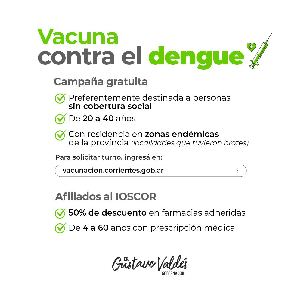 “Como Gobierno de Corrientes tomamos la decisión de proteger a la población. En este caso la vacuna no es obligatoria, es optativa”, puntualizó Valdés, dejando en claro que en esta primera etapa la vacunación se va a realizar en las zonas del norte de la Provincia, en donde existe mayor incidencia, para luego “abarcar otras ciudades y otras franjas etarias”.