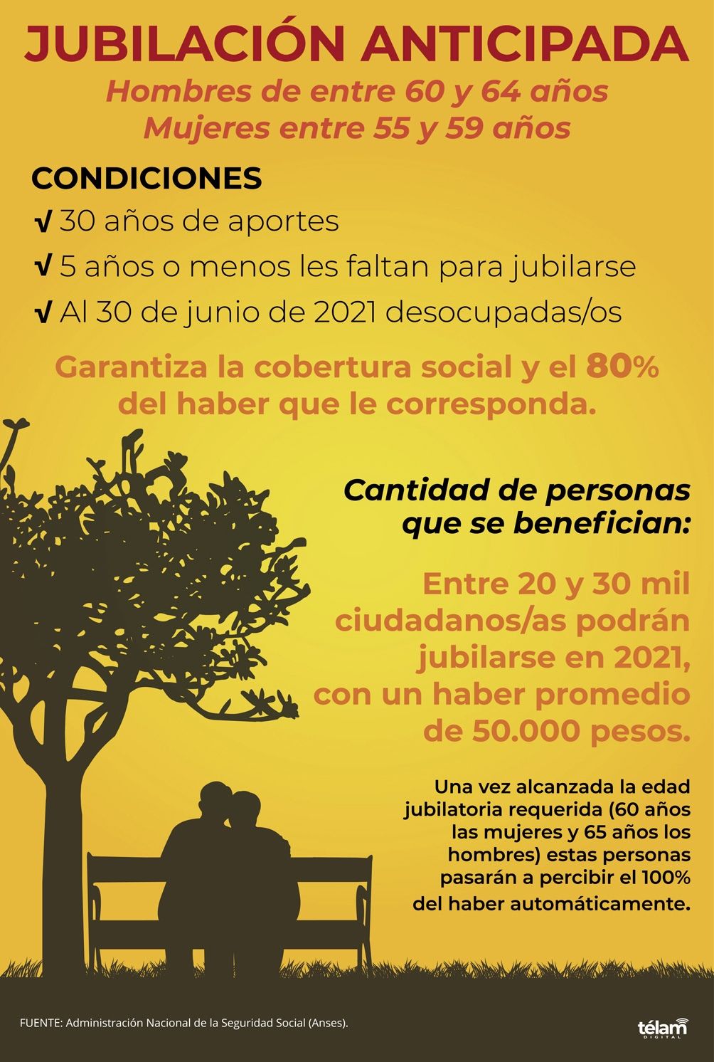 • Según se informó oficialmente, la jubilación anticipada alcanzará avarones de entre 60 y 64 añosymujeres entre 55 y 59 años, a quienes garantizará la cobertura social y el 80 por ciento del haber que le corresponda mientras se llega a la edad dispuesta por la ley.