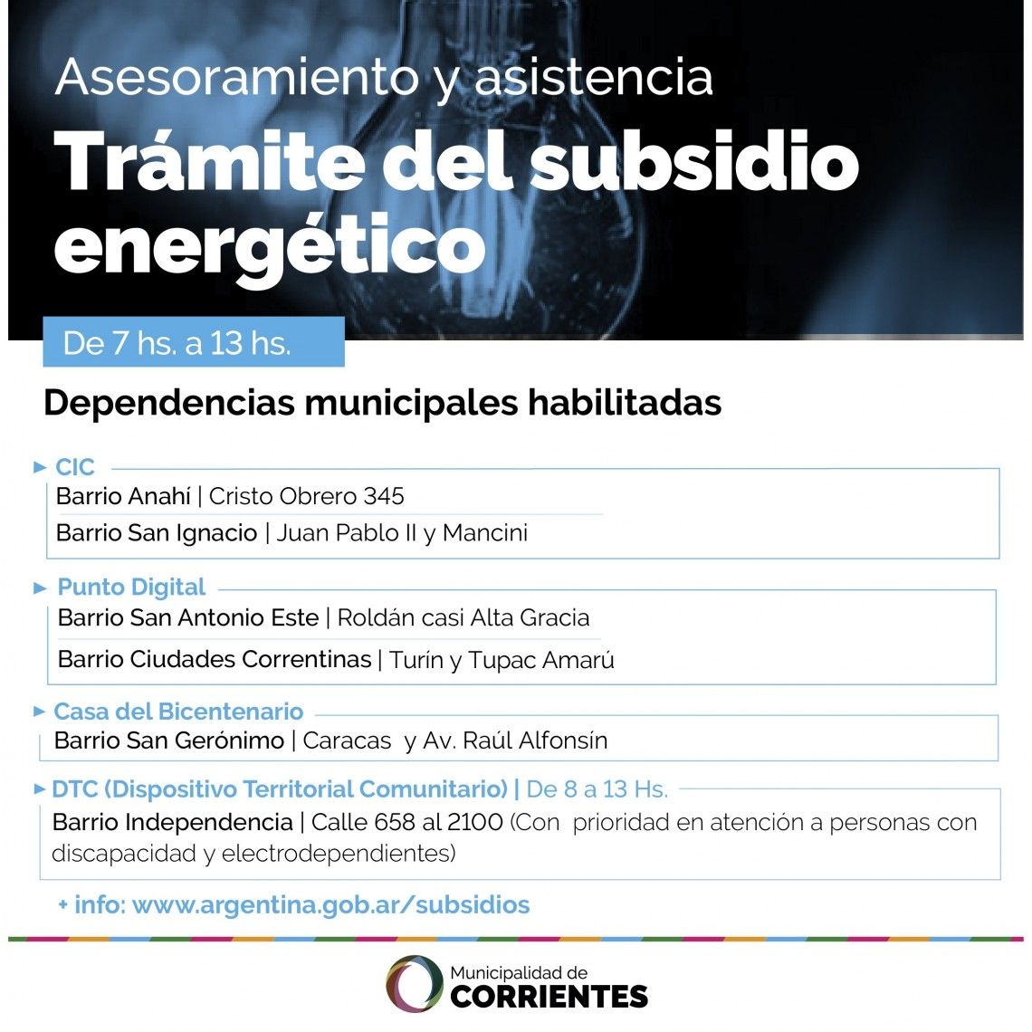 La Municipalidad informa quea partir de este miércoles se sumarán nuevos puntos de asesoramiento a los vecinos en los barrios San Ignacio y Ciudades Correntinas, para completar el formulario correspondiente para mantener el subsidio al consumo eléctrico en hogares, en el marco de la segmentación de la tarifa energética dispuesta por el Gobierno nacional.