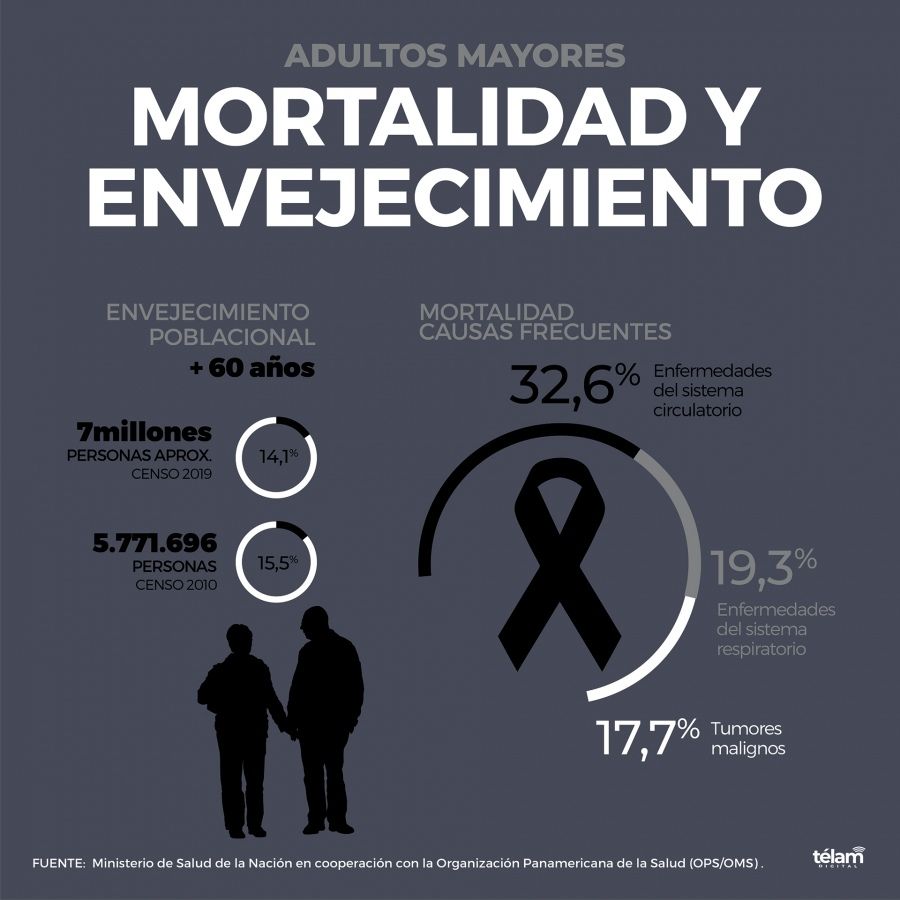 Además, se detallaronlas causas más frecuentes de mortalidad en las personas mayores son las enfermedades del sistema circulatorio (32,6%), las enfermedades del sistema respiratorio (19,3%) y los tumores malignos (17,7%).