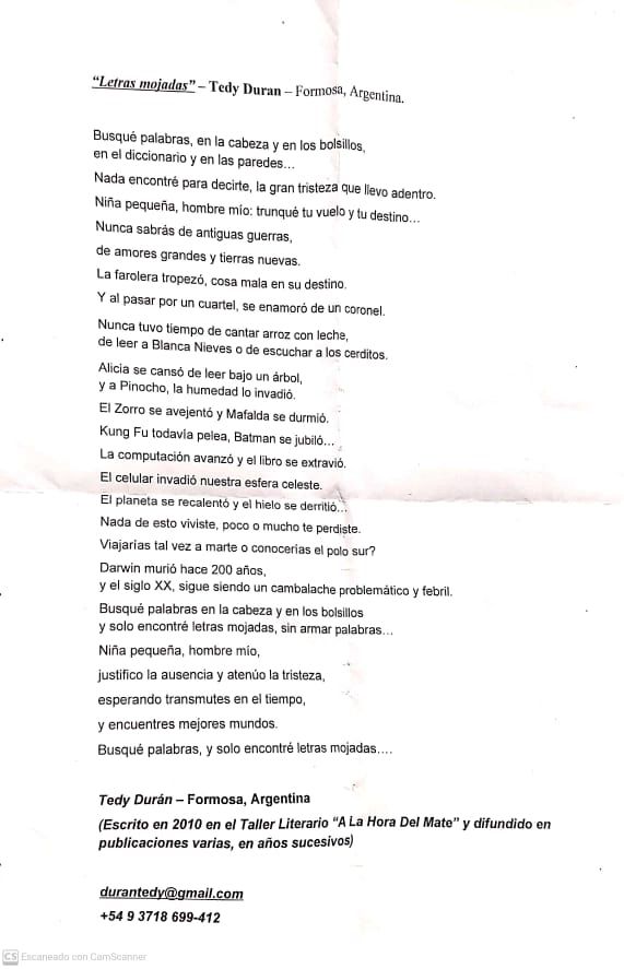 En nuestro último programa nuestra querida amiga Laila E. Daitter, en su espacio habitual de “Promoción de la Lectura”, compartió un fragmento de la poesía titulada ”Letras Mojadas”, de la escritora formoseña ‘’Tedy Durán’’.
