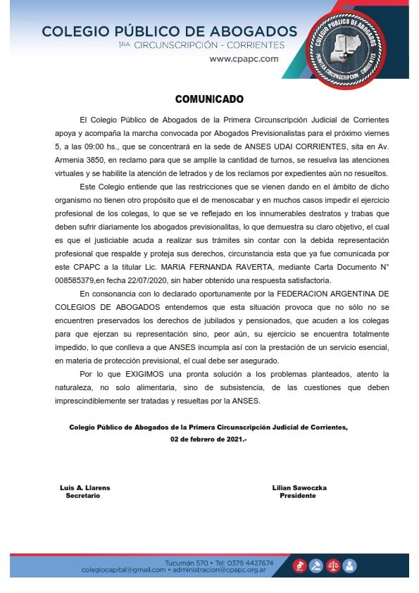 EnCorrientespuntualmente el Colegio Público de Abogados de la Primera Circunscripción Judicial de Corrientes ”apoya y acompaña la marcha convocada por Abogados Previsionalistas para el próximo viernes 5, a las 9hs que se concentrará en la sede de ANSES UDAI Corrientes, sito en Av Armenia 3854, en reclamo para que se amplíe la cantidad de turnos, se resuelva las situaciones virtuales y se habilite la atención de letrados y de los reclamos por expedientes aún no resueltos”.