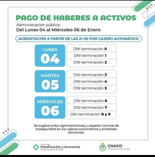 Por su parte, los agentes activos de la Provincia tendrán sus sueldos acreditados a partir de las 21 del lunes 4 de enero para los trabajadores con la terminación del DNIen 1, 2 y 3.