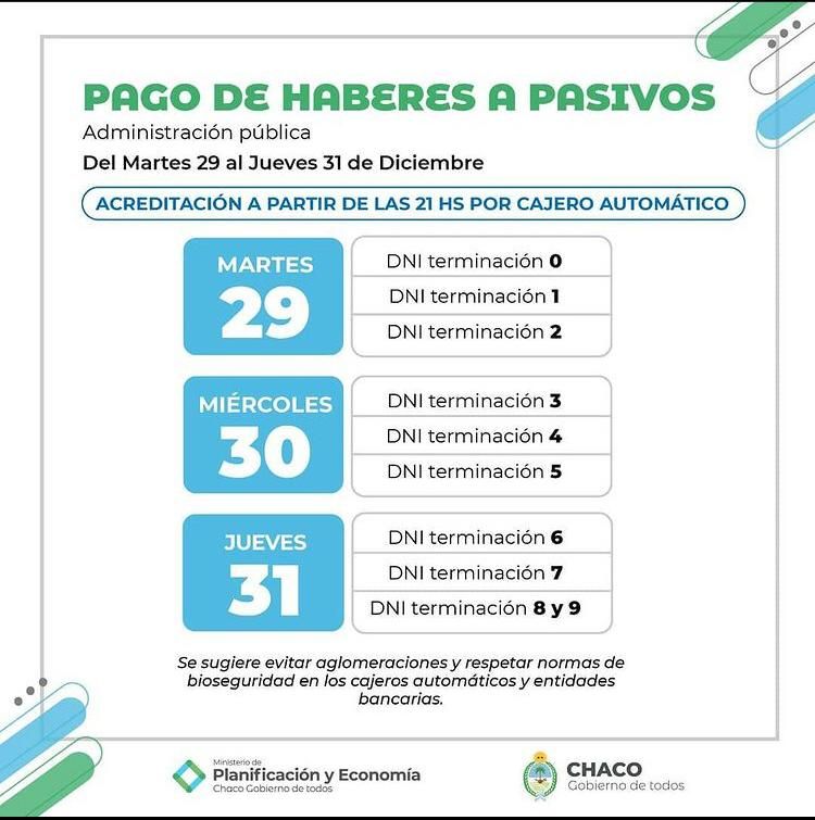 Los agentes pasivos de la Provincia contarán con sus haberes depositados a partir de las 21 de este martes, y continuará el miércoles y jueves, según la terminación del DNI. En tanto los agentes activos percibirán sus sueldos el lunes 4, martes 5 y miércoles 6 de enero, siguiendo la terminación del número del DNI.