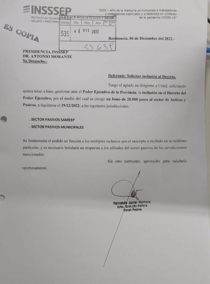 El sector pasivo de la empresa que brinda el Servicio de Agua y Mantenimiento Empresa del Estado Provincia (Sameep) junto al sector pasivo Municipal de toda la provincia de Chaco, a través del vocal pasivo Fernando Javier Romero, entregó nota al Sr Presidente de la Obra Social de Chaco (INSSSEP), Dr Antonio Morante, solicitando gestionar los fondos necesarios ante el Poder Ejecutivo de la Provincia; a los fines se abone a estos sectores el Bono de 20 mil pesos.