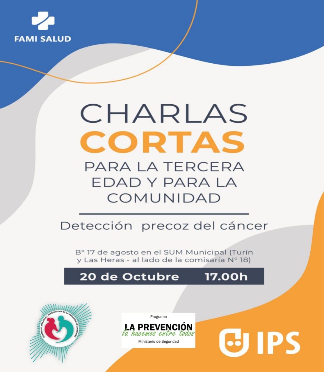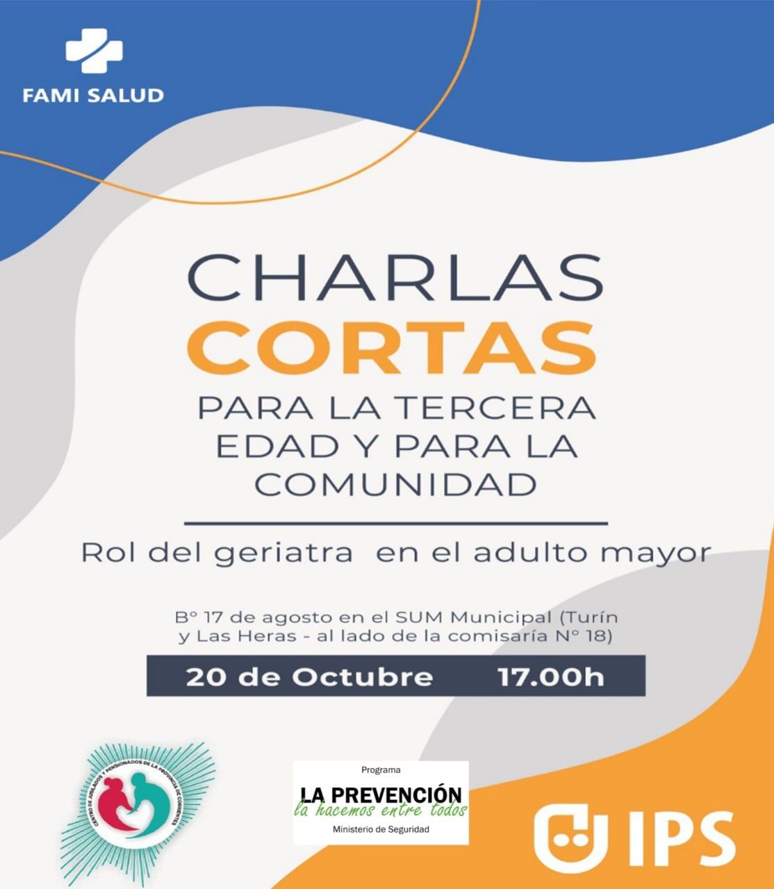 Este miércoles 20 de octubre desde las 17 horas en el SUMdel Barrio 17 de Agosto dará comienzo el ciclo de Charlas Cortas para la Tercera Edad organizado en conjunto por el Instituto de Previsión Social y el Centro de Jubilados. “Detección precoz del cáncer”, “Nutrición y 3ra Edad”, “Rol del Geriatra en el Adulto Mayor”, serán las primeras temáticas que se abordarán junto al Club de Abuelos “Los Paya Abuelos”.