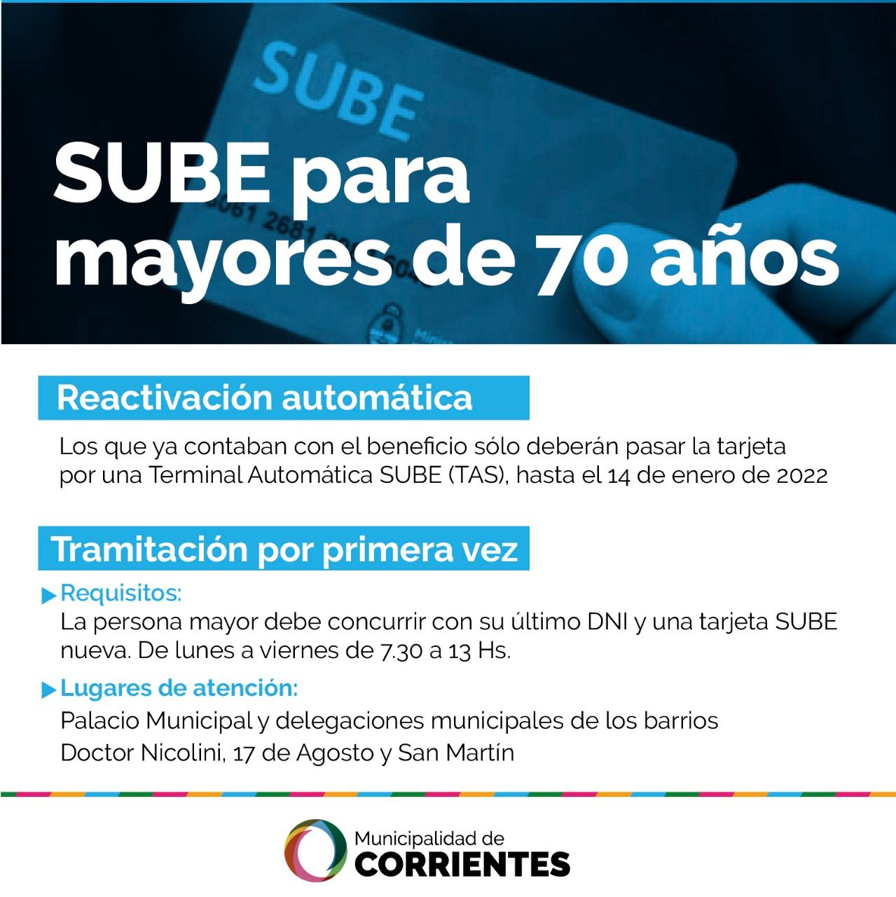 Por otra parte, Rueda informó que “se encuentran habilitados centros de atención SUBEpara aquellas personas que hayan sufrido robo, pérdida o extravío de la tarjeta, o que tengan que hacer el trámite por primera vez, ya sea porque nunca quisieron ocupar el atributo o porque recién hayan cumplido los 70 años”. En estos casos pueden pasar por la Municipalidad (25 de mayo 1132), o por las delegaciones de los barrios Doctor Nicolini, 17 de agosto y San Martín, en días hábiles de 7.30 a 13.