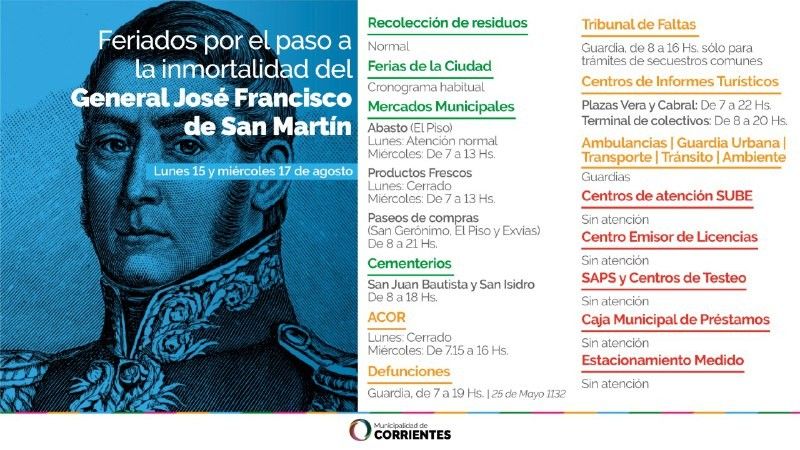 La Municipalidad de Corrientes informa acerca delfuncionamiento de los servicios que habitualmente brinda en virtud del feriado nacional del lunes 15 de agosto, y el feriado provincial del miércoles 17, en conmemoración al 172º aniversario del fallecimiento del General José Francisco de San Martín.