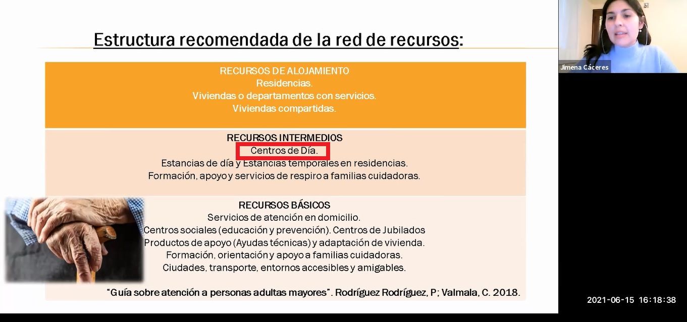Luego de explicar en qué nivel de red de recursos se encuentran los Centros de Días, definió a los mismos como ‘’centro gerontológico de atención integral y centrada en la persona que, de forma ambulatoria, presta servicios especializados a personas adultos mayores en situación que viven en sus domicilios, apoyando también a sus familias cuidadoras’’ (IMERSO, 2005; Rodríguez P, 2005)