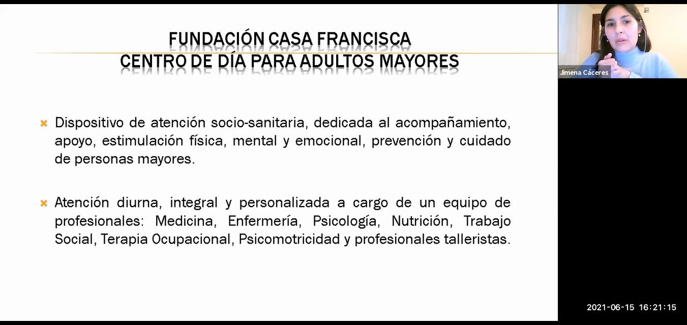 La responsable de la institución – junto a su equipo de trabajo – explicó la red de servicios de Casa Francisca. Asu vez, con una breve introducción sobre el envejecimiento poblacional en el mundo, destacó la importancia de la modificación y la nueva configuración de demandas en la sociedad.